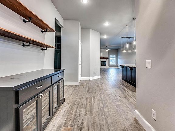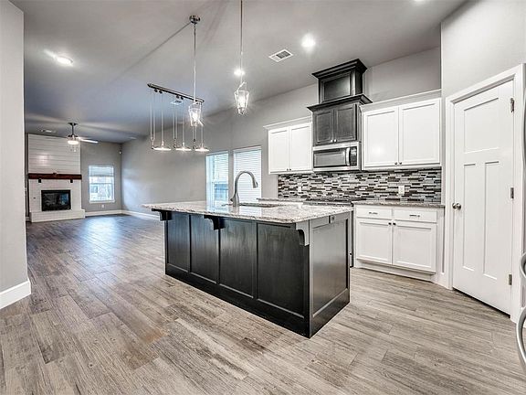 Welcome to your ideal family retreat in this charming Craftsman-style home, designed with open spaces and modern living in mind. The inviting covered front porch and spacious covered back patio set the stage for both lively gatherings and peaceful relaxation. Inside, the heart of the home features a stylish kitchen with gorgeous granite countertops, a 5-burner gas stove with Wi-Fi connectivity, a generous breakfast bar, and a dedicated coffee bar for your morning routine. The separate laundry room enhances practicality and organization. The sun-filled dining area seamlessly connects to the living room, creating a perfect space for family interactions and entertaining. The living room is designed with modern families in mind, offering ample wall space for TVs and a built-in surround sound system that enhances your entertainment experience. The master suite is a serene retreat with a walk-in closet that includes additional shelving, and a luxurious bath with a solid surface dual vanity, separate makeup vanity, and a spacious shower. Secondary bedrooms are thoughtfully sized to accommodate growing families, and the hall bath features a solid surface vanity for durability and easy maintenance. For added safety and convenience, the garage includes an underground storm shelter. The home is surrounded by a fully wooded fence ensuring privacy and security. With a brand-new, oversized HVAC system, you’ll stay comfortable year-round. Located just minutes from the OU Campus, this home offers a blend of modern amenities, functionality, and a welcoming atmosphere that’s perfect for family life.