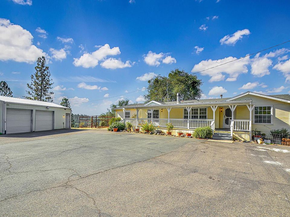 Estate Sale-AS IS only. Minutes to town, single story 1782 sf, 2 BD, 2 BA built 1992 on 3.23 AC ridgetop w/40x12 covered deck, panoramic view & 30x24 SHOP! Over 600sf greatroom w/3 sided FP, slider to 480sf covered & gated deck. Spacious open kitchen w/tiled counters. 5x3 island/bar, 5 burner gas cooktop & dbl ovens, pantry w/rollouts, skylight, 8' desk area, lg laundry w/deep sink, 7' cabinets, space for freezer. Apx 350sf master suite, corner jetted tub w/windows & skylight, stall shower w/seat, dbl sinks, walk in closet. 23 x 11 2nd BD, 11' walk in closet, 5' cabinets in hall. Vaulted ceilings & laminate floors thruout, 2x6 walls, FP & central H&A, whole house fan, 6 lighted ceiling fans, skylights, gridded & arched windows. Easy access to kitchen & bath from yard. RV access to 720sf steel shop w/12' insulated ceilings, two 10' doors w/auto openers, workbench, cabinets, shelving & pegboards, flood light on exterior & lots of paved parking. Paved County road, mailbox at dbl gated paved driveway, plenty of usable land, 2 sheds (12x8 & 12x7), 24x16 fenced garden, apx 40x25 animal pen, driveway to hidden away apx 30x25 extra pad (40' container not included in sale). F/W/D incl. Easy ramp access w/4 step entry. Home sited for maximum privacy from neighbors.