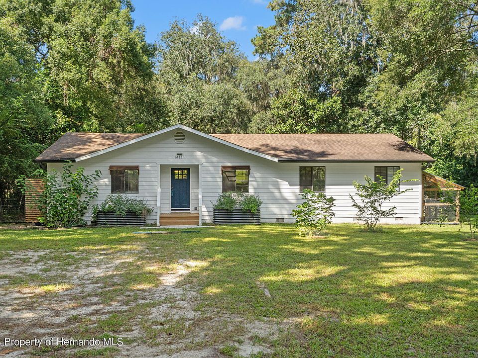 ACTIVE UNDER CONTRACT- Accepting Back up offers. Discover the charm of this beautifully updated 4-bedroom, 2-bathroom country home located off a paved road on nearly 2 acres! With 1438 sq ft of living space, it features a modern kitchen with shaker cabinets, butcher block countertops, and stainless steel appliances, along with a cozy eat-in area. Enjoy updated laminate flooring throughout and a spacious great room, plus a master bedroom with a stylish bathroom boasting a tub and shower combo. The light-filled interior includes an inside laundry room with extra storage. From the kitchen, step outside to a large wooden back porch deck with sun shade, a perfect place to entertain family and friends or to just relax and enjoy some peace and quiet while enjoying a cup of coffee. Other features include: a newer 4 stall pole barn for farm animals with storage room and loft area, storage shed and an open shed with electric and water, chicken coop, and fenced-in garden beds. Parcel size is beyond fenced in area. Conveniently located for easy commutes to Tampa, Ocala, or Orlando, this move in ready home offers the perfect blend of country living and modern amenities. Schedule an appointment to see this home today, very easy show!