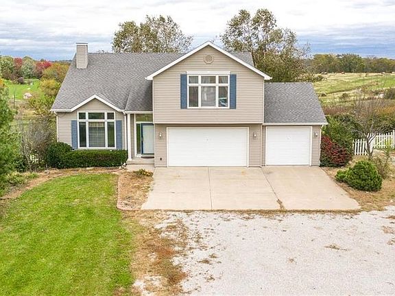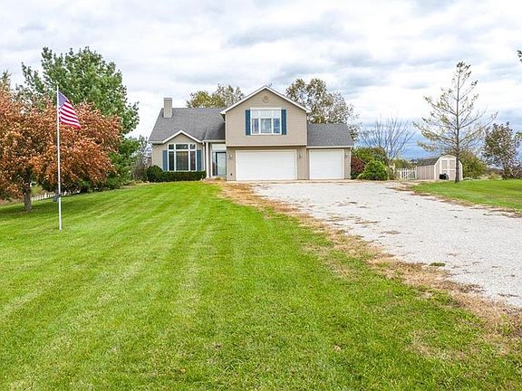 Nestled on 3.24 acre between Excelsior Springs, Kearney and Liberty! Spacious, open floor plan with a loft kitchen overlooking the grt, rm. Separate mstr. br. level with a huge mstr. bth & W/I closet! Main fl. lau. Sub bsmt. Lower level walks out to a covered patio and perfect for a separate living area with a full bth, family room & 4th br. Bright/Cheery from an abundance of windows overlooking a great country setting. 2 yr. 16x24 Pole Barn. Tons of perennials waiting for a green thumb touch!