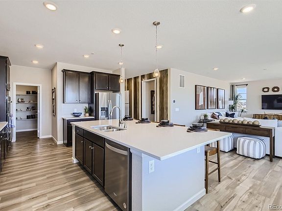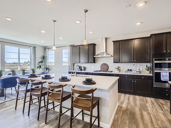 On the main floor of this elegant two-story floorplan, you’ll be inspired by open-concept layout, anchored by a spacious great room, an ample dining area and a well-appointed kitchen—boasting a generous walk-in pantry, center island and direct access to the back patio. Additional main-floor highlights include a private study, a valet entry off the garage and an oversized coat closet. As you make your way upstairs, you’ll find three secondary bedrooms (one with its own private en-suite bath and the other sharing a hall bath) a conveniently located laundry room, loft, and a spacious owner’s suite, featuring a walk-in closet and deluxe private bathroom with dual vanities and walk-in shower. The full basement features 9' ceilings and rough-in plumbing for future bath. Interior finishes include espresso stain cabinets, quartz counter tops, stainless steel appliances, LVP flooring throughout entire main level, upgraded carpet/pad, full kitchen backsplash, open railing, tiled bathroom floors and more!