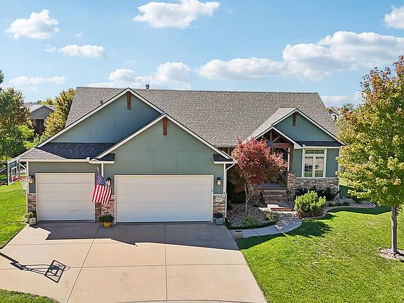 Welcome home! From the moment you step onto the eye-catching front porch, you know you are going to love this 5-bedroom, 3-bathroom beauty in the desirable Chestnut Ridge Subdivision. Nestled on a cul-de-sac, just shy of a half-acre, walk out at grade pond lot, enjoy this outdoor space in the comfort of your screened in covered deck. This home has been tastefully updated and boast a gourmet kitchen with double ovens, huge walk-in pantry, two-sided beautiful brick fireplace, open floor plan, fully finished basement, bar, rec room and a safe room for the Kansas weather. This home also provides a newer roof and newer HVAC system. Don't miss out on the opportunity for Sedgwick County taxes, Andover schools and no specials. Chestnut Ridge Subdivision offers a community swimming pool, playground and gazebo. Schedule a showing today!