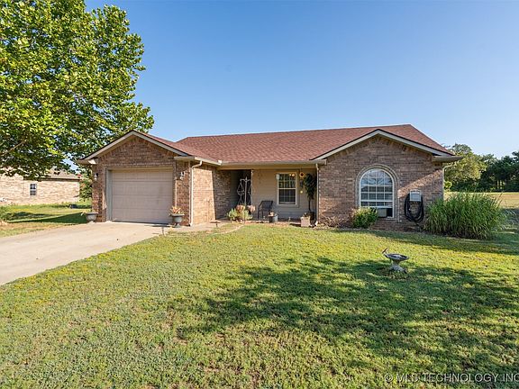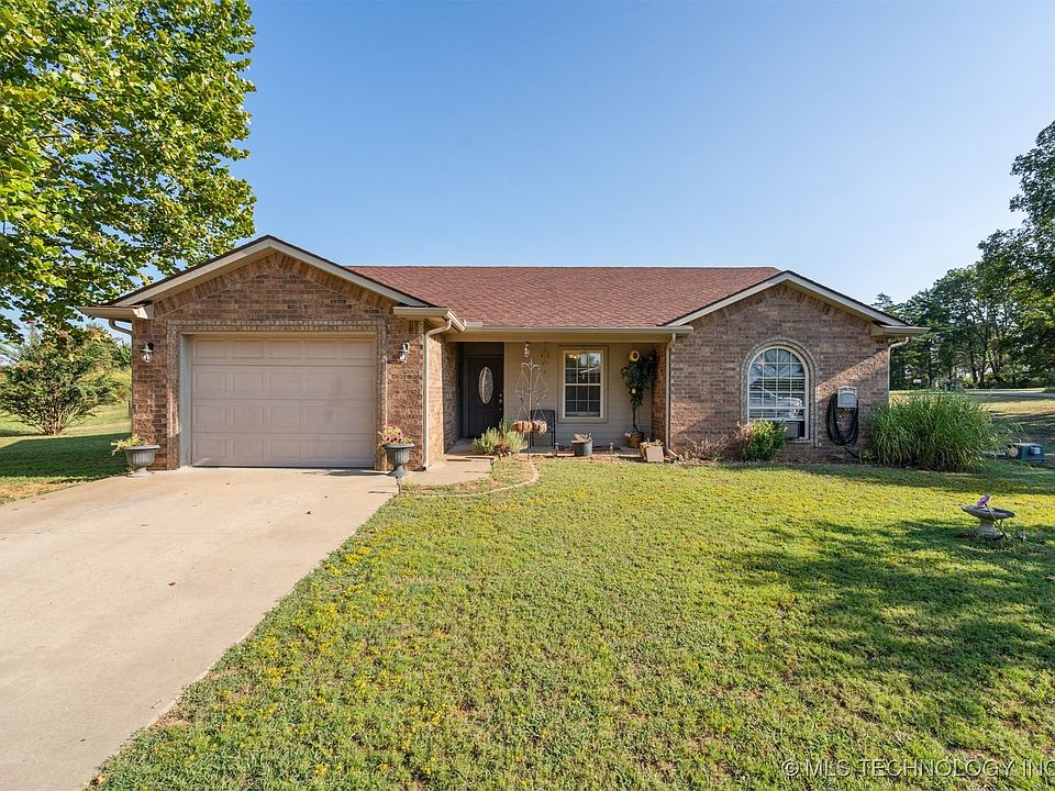 This charming 3-bedroom, 1 and a half bath home offers a well-maintained living space on a spacious corner lot. Step inside to a welcoming living room with vaulted ceilings and soft carpet underfoot. The kitchen features tile flooring, ample cabinetry, and a full suite of appliances including a refrigerator, range, microwave, and dishwasher—perfect for everyday cooking and entertaining. Adjacent is a cozy dining area with natural light and backyard views. The primary suite includes a private half bath and generous closet space. Two additional bedrooms share a full hall bath with updated finishes. Throughout the home, you'll find thoughtful touches like 9' ceilings and a functional layout that maximizes comfort. Outside, enjoy a huge privacy-fenced backyard with a storm shelter, aerobic system, and mature landscaping. A beautiful walnut tree, peach tree, and vibrant flowers add curb appeal and seasonal charm. The attached garage fits one vehicle, and the new roof (installed February 2025) offers peace of mind. Located in a quiet area with easy access to schools and amenities, this move-in ready home truly has it all!