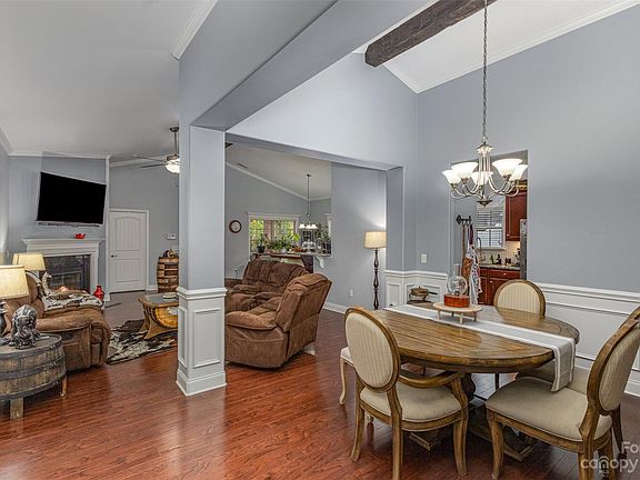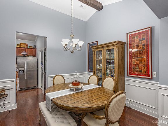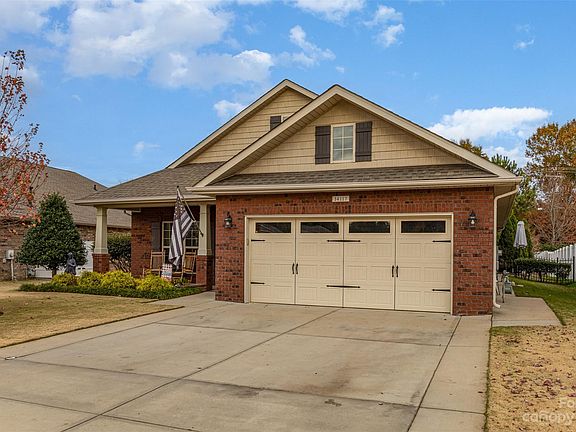 Lovely brick ranch in the Kingsbridge community located in the heart of Steele Creek. This 3-bedroom, 2-bath home has an open floor plan, perfect for entertaining. Enjoy the vaulted ceilings in the great room, adorned with exposed wood beams and a natural gas fireplace. The kitchen has granite countertops, stainless steel appliances and pantry. The large primary suite has a tray ceiling and luxurious bath, dual vanity, separate shower, garden tub and water closet. Hardwood floors in communal areas and nearly new Shaw carpet with memory foam in the bedrooms. The heated/cooled 2-car garage has added attic space for additional storage. The sellers have added elegant cabinetry in the laundry room and primary bath water closet. Crown molding throughout. Beautiful expanded patio, partially covered for multi season enjoyment and added recessed lighting. Short distance to I-77/I-485 with easy access to uptown Charlotte and the airport. Rivergate Shopping Center is only a 5-minute drive.