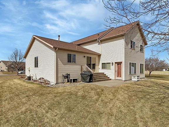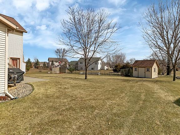 This beautiful modified 2 story features heavy gauge steel siding with brick accents, heated and insulated 3 stall garage with pull down ladder in third stall for storage above, seamless rain gutters, dual pane windows, concrete patio, storage shed with electricity, enclosed garden, immaculate landscaping and an in-ground sprinkler system. The interior boasts a gas fireplace, formal dining room, custom raised oak cabinetry, vaulted ceiling in master bedroom, private master bathroom with sit down shower, 3 walk-in closets, 4 bedrooms on the upper level, 95% high efficiency furnace new in 2009 - the built-in furnace humidifier was new in 2012, plus so much more. Be sure to click on the virtual tour link for an interactive 3-D tour of this beautiful and well kept home that's easily within walking or biking distance to school!!