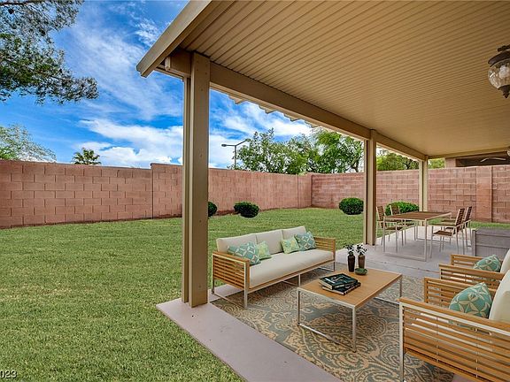 Stunning single story in the heart of Summerlin. Great location in Brookfield, just across from the community park. Freshly painted and ready to move in. Dramatic vaulted ceilings in the Family room and Dining room. Custom niches perfect for cabinets and TVs. Great kitchen with plenty of custom cabinets, granite counters and stainless steel appliances. A large walk-in pantry and breakfast nook complete this open space. The primary suite has vaulted ceilings, walk-in closet, ceiling fan and bath with granite vanity top. Double doors open to the secondary bedroom would also make a great office or gym. Third bedroom features a fan and mirror doors. Large garage with cabinets and entry to the house through the laundry room. Huge backyard covered patio and easy maintenance desert landscape complete this wonderful home. Great location minutes to The Arbors Tree Top Park, Downtown Summerlin, shopping and fantastic restaurants.