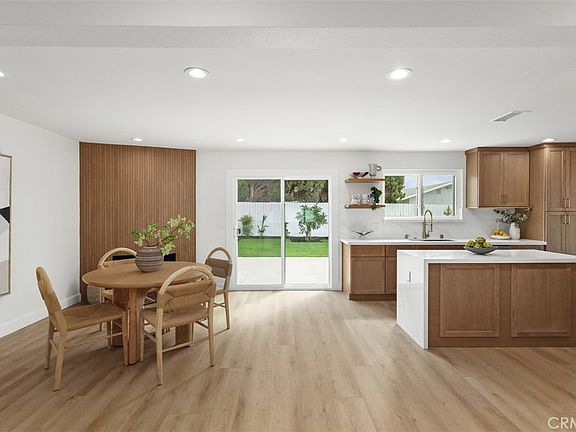 A celebration of clean lines, natural light, and thoughtful craftsmanship, this newly reimagined 1962 Mid-Century ranch-style home invites you to enjoy the best of both past and present. Situated in a charming neighborhood just minutes from Old Towne Orange and Chapman University, the home has been meticulously remodeled with curated finishes and elevated function—creating a space where timeless style meets today’s ease. Spanning approx. 1,469 square feet, the single-level layout flows effortlessly with four bedrooms and two baths, including a light-filled living and dining area anchored by a modern slat-wood fireplace surround. The new designer kitchen opens seamlessly to the backyard and features a dual-waterfall island, full quartz backsplash, light oak Shaker cabinetry, and high-end stainless appliances including a pro-style Z-Line range and drawer microwave. A spacious mudroom with laundry, cabinetry, and sink connects to the freshly finished two-car garage with epoxy floors and new door. Down the hall, secondary bedrooms are bright and functional, while the guest bath pairs timeless black-and-white tile with updated fixtures. The primary suite offers a walk-in closet and a serene ensuite with a custom vanity and walk-in shower. Throughout the home, wide-plank white oak-style LVP, recessed lighting, Shaker doors with black hardware, dual-pane windows, Nest smart thermostat, and Ring doorbell enhance both comfort and style. Outdoors, the 7,070 sq. ft. lot is equally turnkey. A new roof, fresh exterior paint, lush lawn, automatic sprinklers, and tile-finished patio come together to create a front and backyard that feel as effortless as they are inviting. Just two miles from the restaurants, galleries, and vintage charm of the Orange Circle—with easy access to parks, schools, shopping, Angel Stadium, Disneyland, and more—this is a rare opportunity to live beautifully in one of Orange County’s most cherished communities.