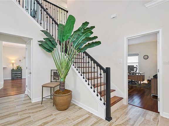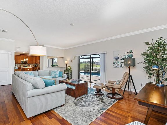 This highly upgraded 5/3 with a huge bonus room is located in Lennar's Championsgate Country Club in the Estates section on a large lot. It has a custom salt water pool and spa with remote controls backing to the #15 fairway. Exquisite furnishings convey with the sale. Many upgrades -extensive hardwood floors including stairs, intelligent thermostats, solar powered lanai lights, water softener, gutters, sealed pavers. Downstairs bedroom is used as an office, and has hardwood floor. The Mazda SUV is negotiable with the sale. Golf membership is included. Enjoy the lifestyle with golf, tennis, and the Oasis amenity center. The Oasis amenity center has a lazy river, a wading pool, a massive quiet pool, poolside cabanas, a Tiki bar, a first class exercise center, restaurant, concierge desk and a theater showing nightly Disney movies. Enjoy this home's outdoor living from your custom pool, spa and lanai that overlooks the golf course with panoramic designed screen panels. Open floor plan is great for entertaining guests. Plus the new Plaza Clubhouse exclusive to Country Club owners will be completed is ready to open.. It includes two pools, a restaurant, pickle ball courts, steam rooms, modern gym and aerobics room, and a quiet meeting room. Championsgate is only 3 miles to I-4 exit 58 which is four miles to the first Disney exit. Shopping and restaurants are nearby. Easy access to all the Orlando attractions. If you want the very best in a second home or primary residence, this is it!