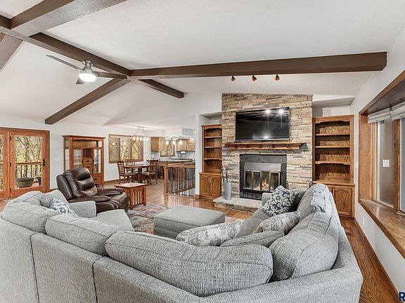 Your Very Own Private Oasis Along W/ No Backyard Neighbors In A Fabulous Neighborhood Makes This Walkout Ranch A Must See! The main level boasts stunning hardwood floors throughout, vaulted ceilings with exposed beams. Open kitchen with breakfast bar, stainless steel appliances, a plethora of cabinets and counter space. The formal dining room & living rooms are sure to impress w/ breathtaking views, floor to ceiling brick fireplace w/built-ins. Desirable 3 bedrooms on same level, large master with en suite and WIC. Nicely sized bedrooms, main floor laundry with additional storage. The walkout lower level hosts a generous family room, rec room and additional bonus room. Completed with 4th bedroom and full bath w/ jetted tub. The tranquil backyard features extensive landscaping, oversized deck, stunning patio and whirlpool tub. Come see your new home today!