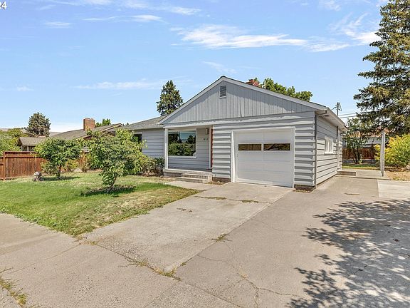 Welcome home to this charming 2-bedroom, 1-bathroom ranch that embodies the essence of coziness and tranquility. As you step through the front door, you're greeted by a warm and inviting living room with large windows, a wood-burning fireplace, and a dining area. This move-in-ready home is situated on a quiet residential street on the east side of The Dalles. The 1,188 sq ft bungalow sits on a .15-acre lot with a generous, partially fenced backyard, perfect for outdoor entertaining, BBQs, or a flower/vegetable garden. It's also an ideal space for pets. There is a single-car garage with ample space for off-street parking in the large driveway and additional street parking. The wood-burning fireplace provides cozy warmth during cooler fall and winter evenings and AC cooling comfort during the warmer summer months. Key features include a renovated bathroom in 2023, HVAC cleaning and servicing in November 2023, interior paint updates in May 2024, and a new refrigerator in June 2024.
