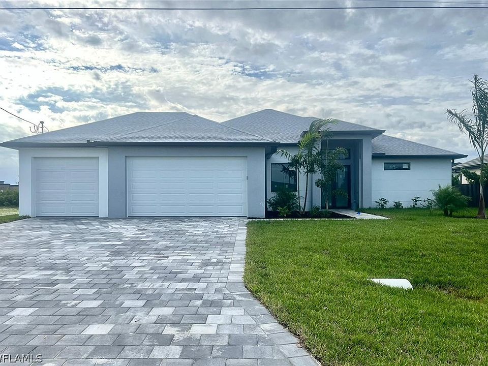 Welcome to your waterfront oasis in Cape Coral, FL. THIS NEW CONSTRUCTION HOME IS MOVE-IN READY! This stunning pool home is on a freshwater canal lot. It is close to shopping, dining, schools, entertainment, and everyday conveniences. With city water and sewer in place, this elegantly designed home boasts an open-plan concept and extends to outdoor living with a large paver lanai with an outdoor kitchen. It features 3 bedrooms + Flex/ Study Room, 3 Full Baths, and 3 oversized car garages. The exquisite kitchen features rich granite countertops and 42" kitchen cabinets, 8-foot raised panel interior doors, and an open great room making it a light and bright floor plan. Energy-efficient kitchen appliances, impact-resistance glass windows, sliding glass patio doors, and front door! Wood-like tile floors throughout the house, high flat ceilings with coffers, beautifully landscaped yard with an irrigation system. Make your showing appointment, you will fall in love with this home!!! Note: The interior photos are from a home with the same floor plan and design.