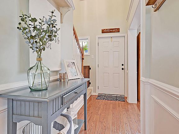 BEAUTIFUL HOME with WONDERFUL CURB APPEAL: 3 bed, 2.5 bath, 2 car garage, fenced yard in desirable The Peninsula neighborhood! This home features many upgrades including solid surface countertops, stainless steel appliances, wood floors, wainscoting, and crown molding in foyer/dining room, and fireplace in the family room. The large primary bedroom with ensuite spa-like bath and two additional nicely sized bedrooms are upstairs. The ensuite bath has a dual vanity, large shower and storage closet within. The large private fenced backyard backs to trees.This home has it all and will not last-call today for showing!