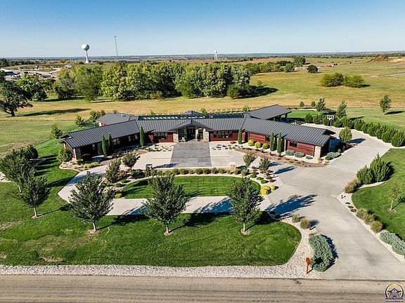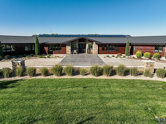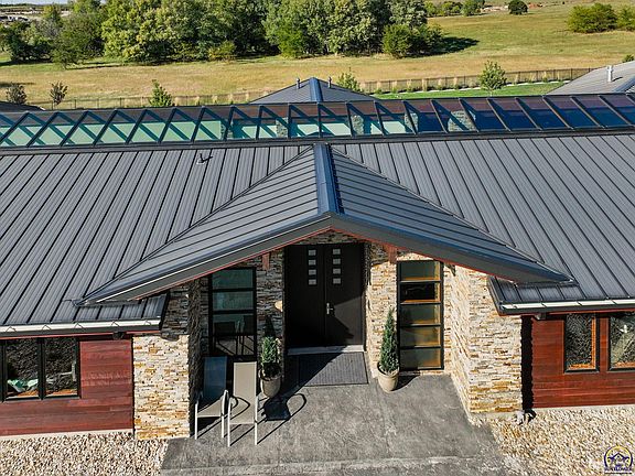 Welcome home to your dream-come-true with this stunning, modern ranch! Open the door, be wowed with gorgeous Bulgarian stone, Italian imported tile floors and 78’ of skylight pouring breathtaking, natural light into the entire home. This home has style in every detail! At the heart of the home, you will fall in love with the spacious chef’s kitchen, complete with luxury appliances including Wolf double ovens and gas range, Sub-Zero fridge, 2 full sinks, 2 dishwashers, a 20’ foot island with ample working space, beautiful cabinetry and a breakfast nook, surrounded by a formal DR, open family room, Butler’s pantry, walk-in pantry and oversized mudroom. Other interior features include 9’ doors, custom woodwork, a dedicated office space, dedicated BAs for each of the 6 BRs, large exercise room complete with Clearlight, infrared dry sauna, a brag-worthy theatre room, bonus craft/play room in the bsmt, storm shelter, tons of storage, and updated spaces ready for move in. Located less than 15 minutes from Manhattan, and resting in the peaceful setting of the open flint hills, you’ll get a little slice of both city and country life- the best of both worlds. Prefer to enjoy the Kansas prairie views from outside? No problem! Around the exterior of this home, you have both covered and uncovered, outdoor living spaces overlooking several acres of beautiful prairie. A one-of-a-kind home with the right space in all the right places! Perfect for large crowds or intimate gatherings alike!