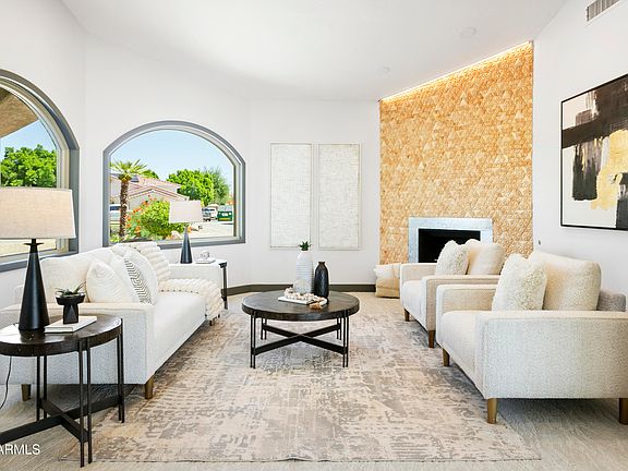 Welcome to elevated living in this beautifully reimagined 3,656 sq ft custom estate, perfectly nestled on a generous 19,327 sq ft lot overlooking the 6th Green of the Wigwam Red Course. Located within the highly coveted gates of Litchfield Greens, this 2024 renovation masterfully fuses timeless sophistication with state-of-the-art enhancements. Enjoy panoramic golf course views from the expansive Great Room, Kitchen, Dining and Primary Suite. This estate is designed with both everyday comfort and upscale entertaining in mind. Enter into a grand first impression, this circular foyer welcomes you with soaring ceilings that create a breathtaking sense of space and light. The architectural curves guide your eye upward, drawing attention to the expansive height and setting a tone of timeless elegance. The entry leads to an open living room where the heart of the space is a sleek, modern gas fireplace, seamlessly embedded in a show-stopping wood feature wall. This custom-crafted backdrop is a work of art. Transition into a stunning great room, where your eyes are immediately drawn to the custom Pella windows perfectly placed to flood the room with natural light. Through them, your very first view of the 6th green is nothing short of breathtaking. The chef's kitchen is masterfully designed with new top-tier Wolf Subzero appliances including an induction cooktop, built-in refrigerator and wine fridge, drawer microwave, dual traditional and convention steam ovens, two beverage refrigerators, Scotsman ice machine, and a Miele dishwasher. The elegant oversized island is the centerpiece of this spectacular culinary haven adding sophistication along with additional storage and seating. Behind this kitchen is an elegant custom library with built-in shelving creating a flexible space for a home office, den, or easily converted formal dining room. The Primary Suite is a luxurious retreat, complete with automated blackout shades, high-end wool carpeting, and a private gym. The spa-inspired bath boasts a Mr. Steam shower, built-in custom closet with ample storage, and a private water closet featuring a Toto heated, auto-lid bidet. Designed as a true split floor plan offering privacy for guests or family with three additional bedrooms, each with their own en-suite bath, and an extra guest powder room. No detail was overlooked in the full 2024 renovation including: New roof and dual Lennox HVAC systems, Low-E Pella fiberglass windows, 2 Rinnai tankless water heaters with circulation pump, whole house water softener & carbon filtration system, luxury vinyl flooring, custom tile work, a full Shasta pool remodel with all new automated equipment and heater plus extended honed marble patio, new outdoor kitchen and landscaping updates. Enjoy exceptional energy efficiency and independence with a fully owned 15.39 kW Tesla Solar System paired with a 40.5 kWh Powerwall keeping utility costs low and eliminating peak usage concerns. A rare offering for the most discerning buyer combining polished luxury, advanced efficiency, and a magnificent golf course setting we invite you to experience one of Litchfield Park's finest custom homes.