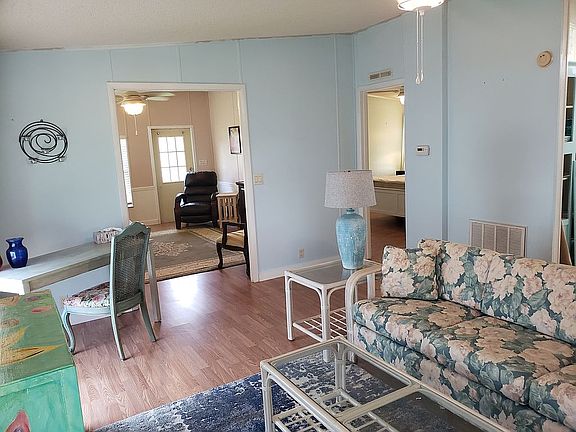 Fully furnished home with wood laminate flooring throughout. Nice color on the walls. Master bedroom with en suite and second bedroom has a nice size closet. Inside Laundry. Eat in kitchen has plenty of cabinets and access to the dining area. Living room is perfect size and there is a den or family room for extra space. Some walls have nice wood paneling and bead board. Good size shed is at end of carport and there is a bigger side yard than most. Newer appliances stay in this smartly furnished home make your buying decision easy. Roof replaced in 2014 and water heater in 2017.