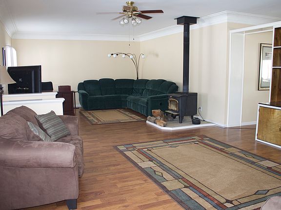 Spacious 2400 Sq. Ft. home on large lot with stocked pond, mature trees, and fenced in back yard. Open floor plan with three large bedrooms and two full baths. Eat in kitchen, dining room, and laundry room. The kitchen features a 7 1/2ft bar open to the dining room. Extra large living room/family room with wood burner and built ins.