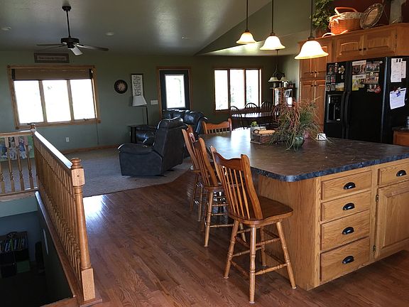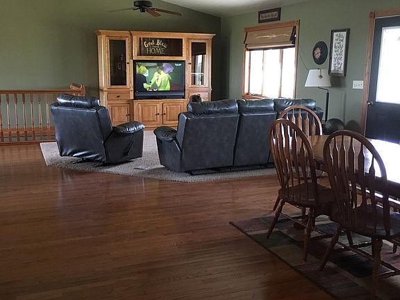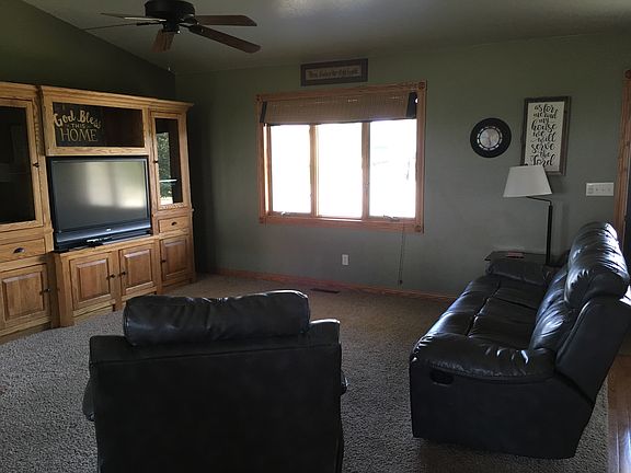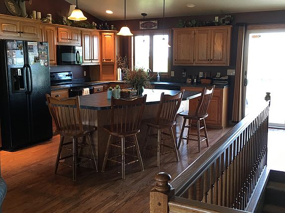 This family friendly home is located on edge of town. Open floor plan. Kitchen includes an island and beautiful wood cabinets. Off the kitchen the patio door opens to deck and cement patio for grilling. Master bedroom has master bath and walk in closet. There is another bedroom on main floor and a full bathroom. Basement has 2 bedrooms and bathroom. A large living room and recreation area.
