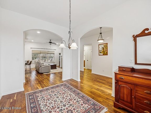 This impressive ranch home with its attractive brick and stone façade is situated on a small cul-de-sac and backs up to fairway 6 of the Polo Fields Golf Course. It features an open and split floor plan with a total of 4 bedrooms, 3 full baths and a huge, finished basement. The welcoming, windowed entry opens to the main level of the home with rough-hewn flooring in the foyer, dining room, great room, kitchen, eating area and laundry room. The great room features a wall of windows, built in cabinetry and a gas log fireplace with handsome mantle and tile enclosure. The adjacent dining room is surrounded by architectural arches and a large front window. The eat-in kitchen with breakfast bar features granite countertops, custom painted cabinetry with nickel hardware, , pantry and stainless-steel appliances including gas range. The eating area opens to a covered rear deck overlooking the yard and golf course. The primary bedroom is large and the primary bath features dual raised vanities, a jetted tub, step-in shower, commode closet and large walk-in closet. The other side of the split floor plan has 2 bedrooms with a full hall bath with shower/tub enclosure between them. There is also a sizeable laundry room on the main floor that connects to the attached 2 car garage. The expansive lower level features a family room, full-bath and 4th bedroom with 2 large egress windows for safety and good natural lighting. The sellers added a room that can be used as an office or fitness space. There is a huge storage area in the basement with built-in shelving. There is a soft water system included with this house that the seller has not used. This lovely community also offers tennis courts, a playground and clubhouse. Polo Fields offers swimming and golf memberships for additional fees.