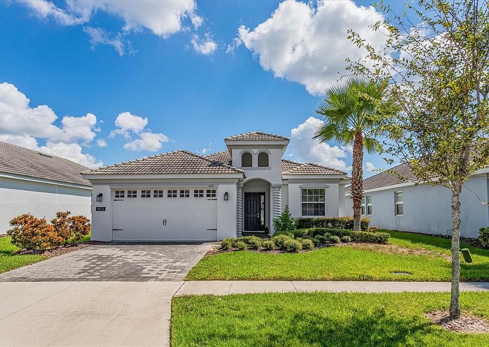 Welcome to 1413 Clubman Dr, Championsgate nestled within the gated STONEYBROOK SOUTH community. This stunning Mediterranean-inspired home boasts 4 bedrooms and 2 bathrooms and offers 2269 square feet of living space. Step inside and be greeted by lots of natural light highlighting the open-concept design and soaring high ceilings. The kitchen is the main focal point of this home and is a true culinary masterpiece, featuring granite countertops, stainless steel appliances, 42” cabinets, and a spacious island with a sink that will be great for food prep and entertaining. You’ll love this home’s split floor plan including a lavish master suite with his and her walk-in closets, and a spa-like bathroom suite featuring dual granite vanities, a soaking tub, and a separate walk-in shower. The 3 additional bedrooms are ideally situated in the front of the home near the guest bathroom complete with shower and tub combo. Let’s not forget the screened-in covered lanai area located off of the living room which will be a perfect setting for entertaining or relaxation. This home also offers lush landscaping maintained by the HOA and beautiful wood plank tile flooring (no carpet). The community of STONEYBROOK SOUTH is located just minutes from Orlando’s world-famous theme parks, shopping, dining, and entertainment. Residents of this 24-hour guarded gated community will also enjoy 2 clubhouses, resort-style pools, pickle ball courts, tennis courts, a golf course, a water park, a lazy river, and a private fitness center just to name a few of the world-class amenities that are included in this all-inclusive community. With its prime location and impressive features, 1413 Clubman Dr is a dream home waiting to become your reality. Contact us now for more information or to book your private tour!