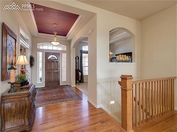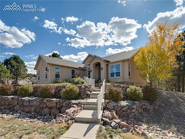 This immaculate custom home boasts everything you are looking for in a ranch plan, on a stunning, large, corner lot with mature trees and beautiful Pikes Peak views. When you first walk-in to the entry your eye is drawn to the crown molding and the 10 ft ceilings throughout the entire main level. This home is every entertainers dream with its formal dining room, butlers pantry, additional eat in dining nook in the kitchen, beautiful great room and a large partially covered patio with gas line ran for your grill. The gourmet kitchen will have you never wanting to leave with its custom cherry cabinets, double oven, in counter system, and gorgeous granite counter tops. Retreat to your main level master suite detailed with crown molding to enjoy your beautiful views and relaxing 5 piece bath and walk in closet. On the main level you will also find another bedroom with a full bathroom right next door, a great size office, and laundry room. Head down to the walkout basement to find another great entertaining space already wired with surround sound and built in speakers, also featuring a wet bar and a second stoned fireplace, three more large bedrooms with another full bathroom attached to one of the bedrooms creating a second guest suite with a walk-in closet and all. You will also find a large storage area, and a small kids hideout are in the basement. Head outside to the great outdoors where you will fall in love with the beautiful Colorado landscaping and views in every direction, the backyard is partially fenced for an animal, but the lot goes way beyond the fence into the mature trees and tranquil outdoor living area. Come see this fabulous ranch plan in the highly desired community of High Pines.
