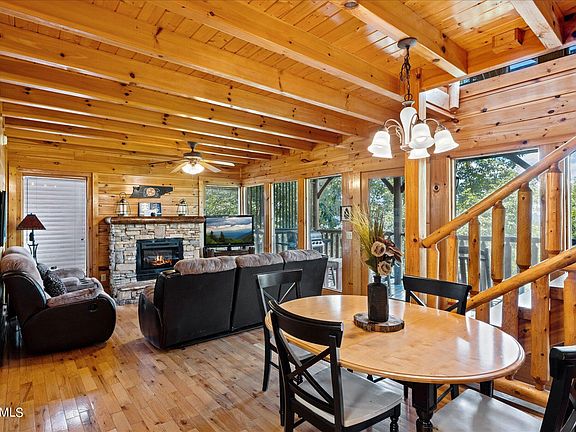 Beautiful views from this incredible, 2 bedroom, 3 bath, log cabin! Spread out over 3 spacious levels and 2,184 square feet, this well appointed cabin has all the features needed to deliver the perfect Smoky Mountain cabin experience. Upon entering, you'll pass through the cabin's fully equipped galley kitchen and into the open dining and living area. Its solid wood walls & doors, exposed beams, log railings and electric fireplace, with custom stone surround, lend a rustic feel to this beautiful cabin. Just beyond the living area, you'll find the first of two spacious bedrooms, with a full en-suite bathroom. The upper level is devoted to an oversized bedroom suite and boasts a soaring wall of windows with stunning mountain vistas! The upper level's en-suite bathroom features both a walk-in shower and a large jetted tub. You'll also find a cozy, built-in sleeping loft! The lower level is home to a second living area and game room, complete with a bar area, and features a pool table and foosball. The lower level also boasts bunk beds for extra sleeping capacity and a third full bathroom. Each of the cabin's three levels features a spacious deck, with the main level boasting an outdoor hot tub. Located in Black Bear Ridge Resort, you will have access to the resort's outdoor swimming pool. There is nothing lacking in this incredible, Smoky Mountain cabin!
