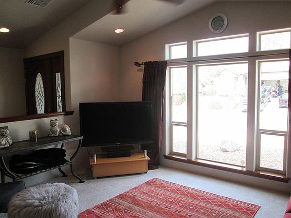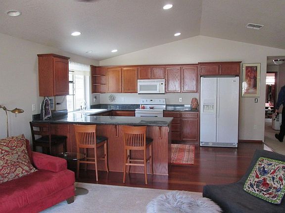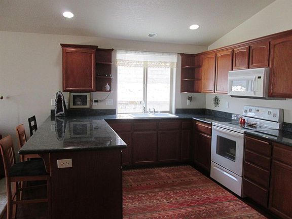 Gently lived in home built in 2005 with 3 bedrooms, 2 baths, 1425 square feet on .19 of an acre. Inside features a living room with picture windows, vaulted ceilings, open floor plan, nice size kitchen with beautiful granite countertops, hardwood flooring, bathrooms with two sinks and a laundry room with cabinets. Ceiling fans throughout make it nice and airy. Master bedroom includes a slider to the back yard. Attached two car garage and side area for extra parking. Easy low maintenance front and back yard with patio to enjoy the mountain views. Located in town, in School District 7 and close to city services. This sweet home is move-in ready!