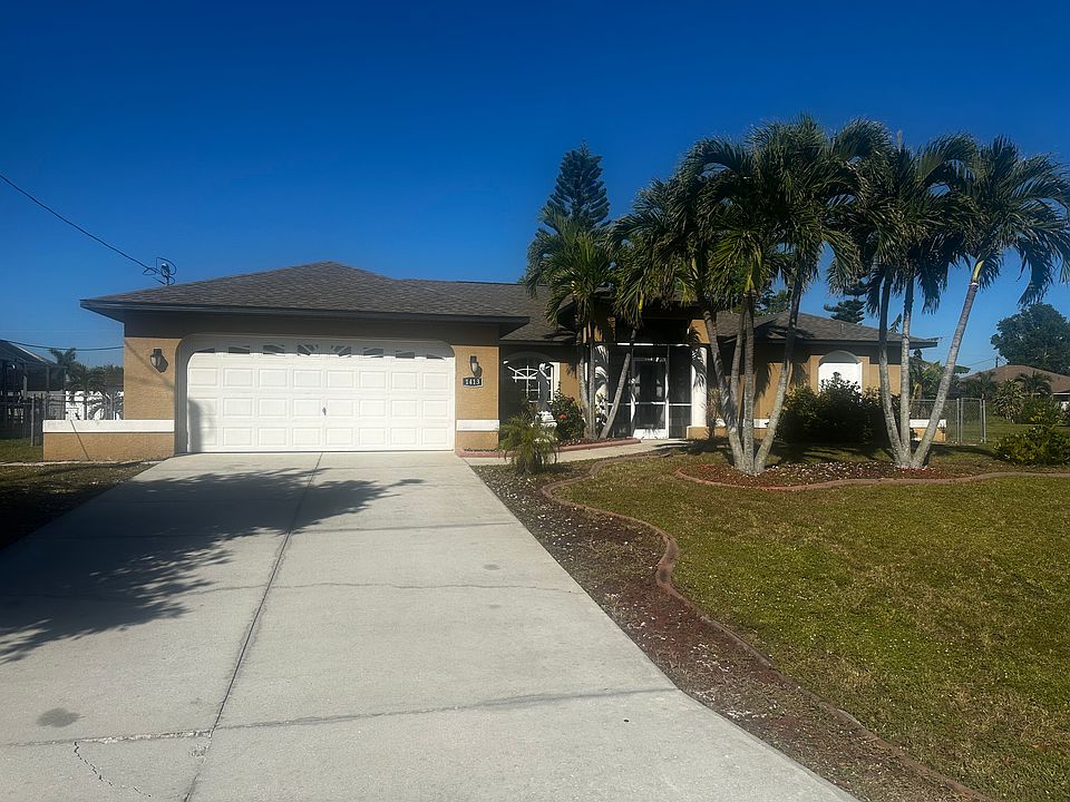 4 bedroom 2 bath pool home (elec. heat) with vaulted ceilings, large covered lanai, and Fenced in pet friendly yard. PEST CONTROL AND POOL SERVICE INCLUDED All bedrooms have walk in closets and lighted fans. Tile throughout. Newer Stainless appliances, New Kitchen, New roof, New master vanity, along with other improvements! Indoor laundry (washer dryer ASIS) and workshop or possible office. Split floor plan, with pocket sliding doors to the lanai as well as a "pool bath" so entertaining and keeping the wet where it needs to be is a breeze. Great location with easy access to restaurants, schools, and shopping. Situated "between the two bridges" to Ft. Myers, and therefore super convenient to getting around the Cape, Ft. Myers, and enjoying beaches, etc. Again, dog friendly home "with pet approval". (added bonus for now, there is a vacant lot next door that gives a little extra room to play and throw a ball for example.) Mango and banana trees in yard. Looking for long term tenants. Call to set up your appointment to view property. All applicants are required to provide credit and background check. Pet friendly landlord, fenced yard, non-refundable pet deposit of $150 required. No large dangerous breeds as per insurance requirements of landlord. Background and credit check required (either recent copy provided by applicant, or $100 application fee for landlord to request from a tenant screening site) . First, and Security deposit due at time of lease signing. Lease provided by Heist, Weisse & Wolk PA attorney