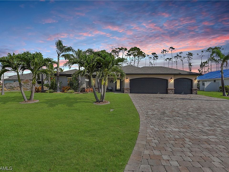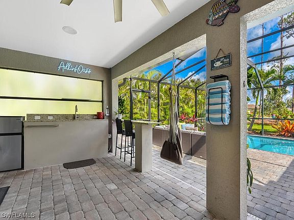 Amazing pool home w/ NEW ROOF AND NEW PAVERS! Located ON Palmetto Pines Golf Club on hole number 16 and no HOA. Gorgeous single family home w/ stone detail on exterior, wide drive leading to huge 3-car garage w/ screen doors, front open lanai, large screened rear pool lanai (w/ covered sitting area, summer kitchen, Sonos sound system that can all be controlled w/ your phone apps), dog run on side of home, built-in 4 ft deep fire pit (perfect for roasting a hot), smoker area w/ custom lighting, great room layout on interior, open concept kitchen, cathedral ceiling, desk are in guest wing, large laundry room w/ folding station & storage, split bedroom floor plan, granite countertops, and custom hanging racks in garage for extra storage. There are motion lights on the perimeter of home and the camera system is on battery back up, app controlled or the computer in the home. Situated in a non-gated neighborhood and backing up to golf course. The home has a convenient location- close to shopping/dining options, public parks & library, just a short drive to public boat ramp, and has easy access to both the N & Midpoint Cape Coral Bridges leading you into Fort Myers.