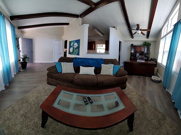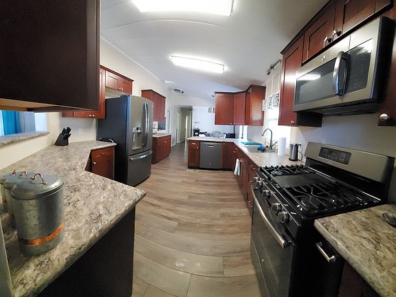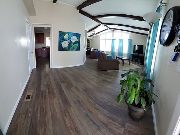 Great family home on a corner lot. Open floor plan with vaulted ceiling in main area of home. Has nice size bedroom and a laundry room. Laundry room includes a laundry sink and LG washer and dryer. Plenty of closet and storage space throughout the house, including closet organizers. Good size master bath with a garden tub and walk-in closet. Remodeled kitchen with GE appliances and french doors that lead outside. New wood laminate flooring, including subfloor, throughout main room, kitchen, dining, and hallway. Bedrooms are carpeted. Fresh paint inside and outside. Windows have aluminum blinds. Installed new master cool about two years ago. Descent size, low maintenance, fully fenced yard on corner lot. There is no parking on the street inside the park so this makes it convenient for visitor parking. Has a brand new 10'x12' shed with custom built shelves. Partially landscaped with two mature trees and a garden area.
