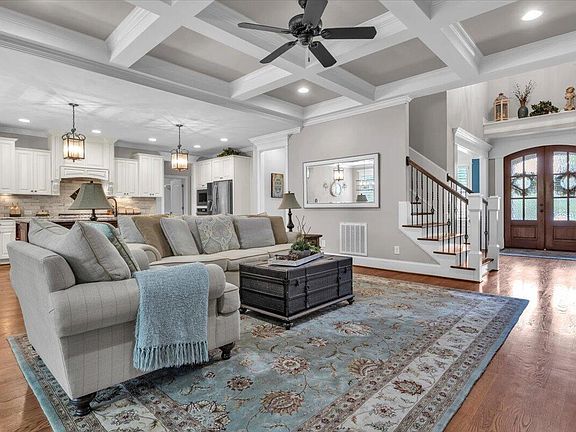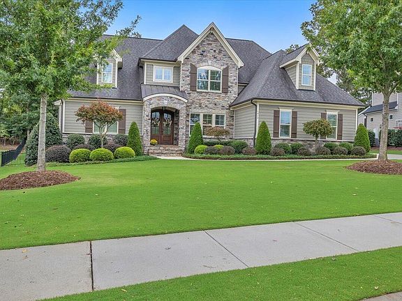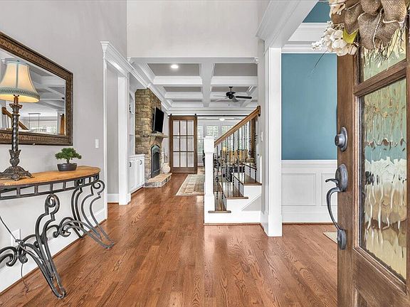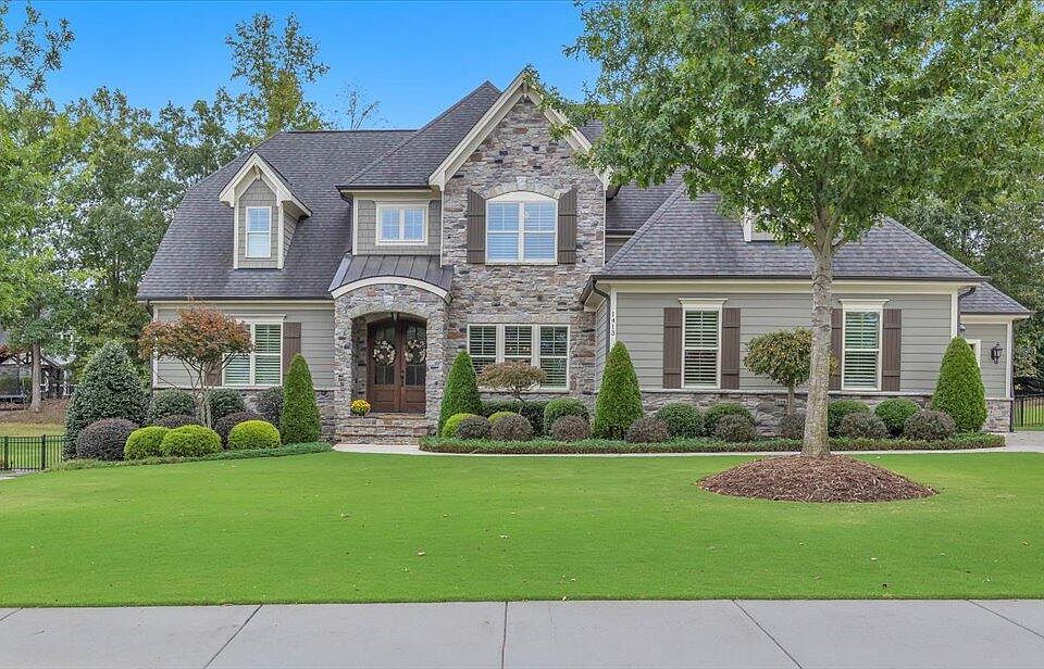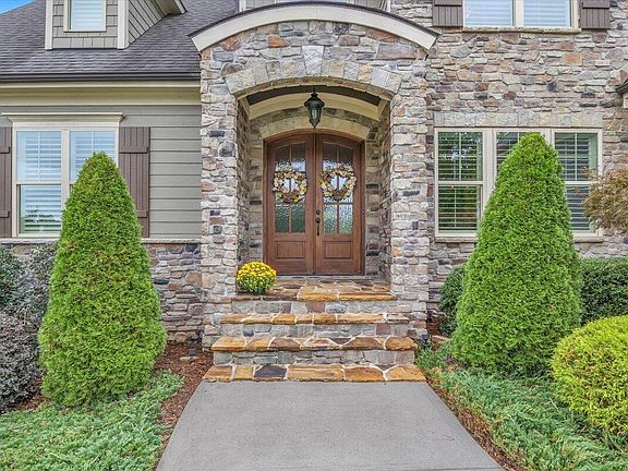 Stunning custom transitional home in Wake Forest, NC, built by Braswell Custom Homes, showcasing European stone accents, Craftsman-style details, and timeless curb appeal. Situated on one of the largest lots in Stonewater and directly across from the community swimming pool, this 5-bedroom, 4.5-bath residence blends luxury, comfort, and convenience. Inside, the main level features a spacious primary suite and a private guest suite, perfect for multi-generational living. The gourmet kitchen connects seamlessly to the formal dining room through a butler's pantry with built-in wine fridge, while a light-filled sunroom extends the living space in lieu of a screened porch. Custom Amish-crafted 9-light barn doors provide a stunning transition between the family room and sunroom, adding both natural light and artisan detail. A hidden room tucked behind a bookcase adds charm and function. Upstairs, you'll find generously sized secondary bedrooms and a HUGE bonus room cleverly divided by a barn door into two separate entertaining or flex spaces. The 3-car garage offers ample storage, and the backyard invites outdoor living with its stone patio surrounded by mature landscaping. This Braswell masterpiece combines thoughtful design with standout features, making it one of the premier homes available in the Raleigh/Wake Forest area.