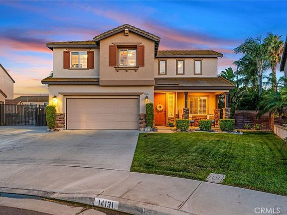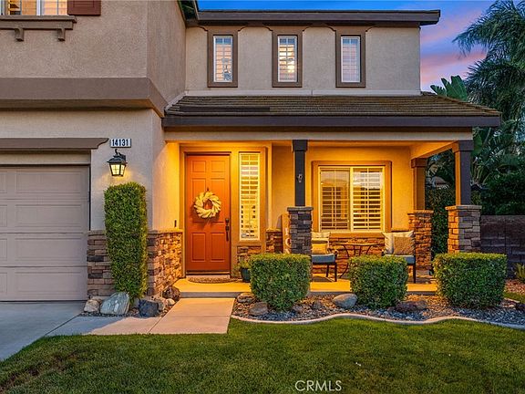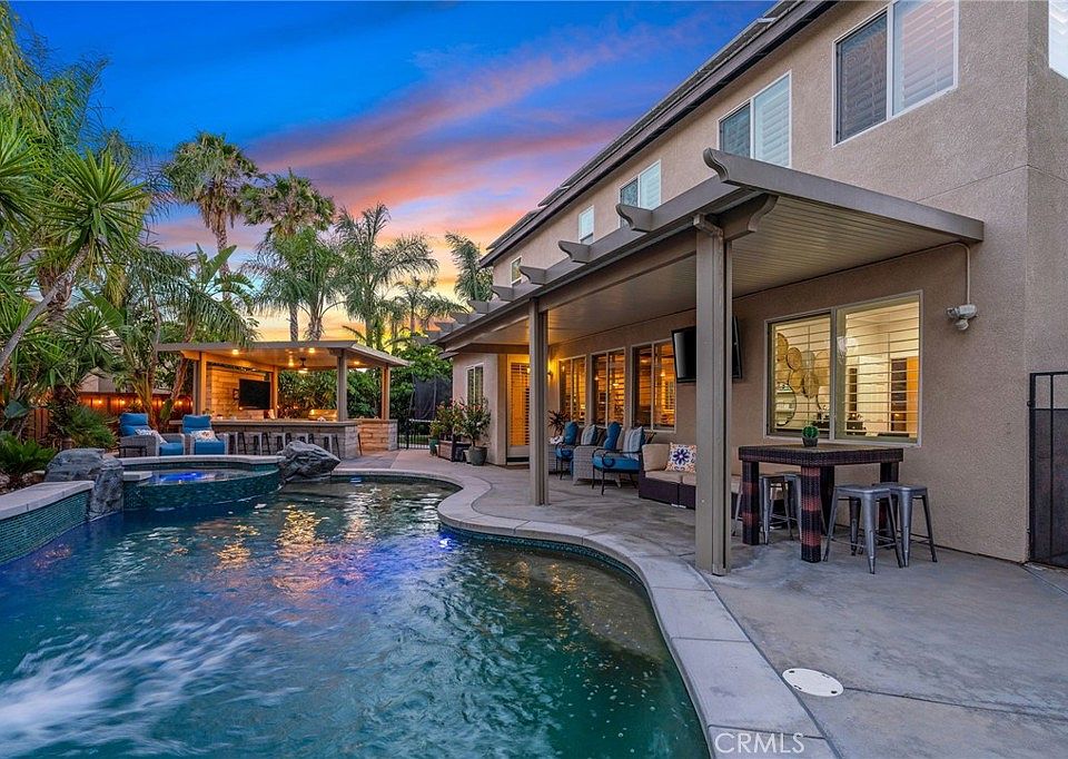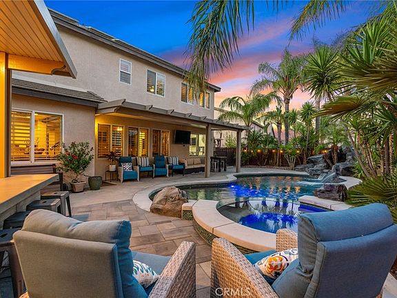 Entertainers Dream Home! Come and fall in love with this gorgeous and spacious 5 bedroom 3 bath house with a loft. Owners spared no expense! Located at the end of a quiet cul-de-sac. One bedroom downstairs (currently a salon). Hardwood floors, Plantation Shutters throughout, Custom Built in cabinets in every room. Updated kitchen with stone countertops, High end appliances, large island with extended seating for 6. Big family room with Built in entertainment center and fireplace. Huge custom wrap around bar with plenty of seating. Crown molding, Whole house fan, New AC unit with Smart home air and heating. Upstairs laundry room, Big primary room with large walk-in closet designed by closet world. Upgraded primary bathroom with dual sinks and walk in shower. Tandem 3 car garage with Epoxy flooring, custom cabinets, sink and overhead storage racks. Remodeled pool with rockslide, new pool equipment, multi color pool lights, and smart wireless iAquaLink app. Outdoor built in BBQ entertainment center, built in fire-pit and mature landscaping. Turf on side yard, Potential RV parking, Storage shed on side yard, Water softener, low Mello Roos. Solar! Must see to appreciate!
