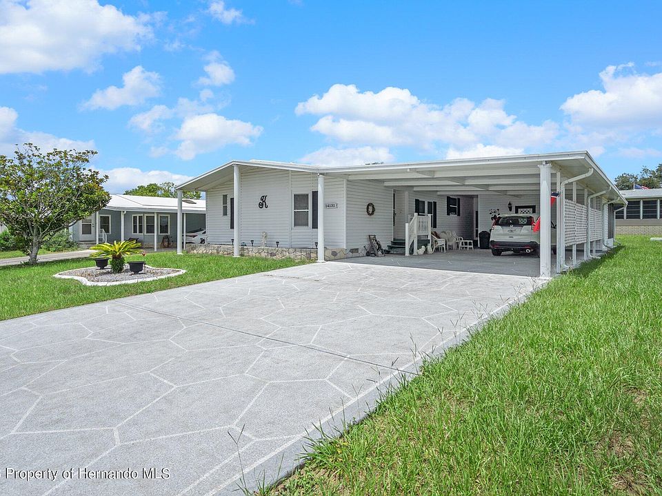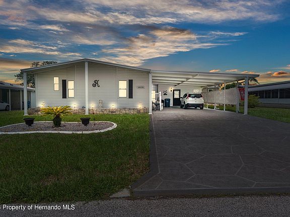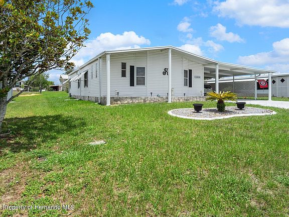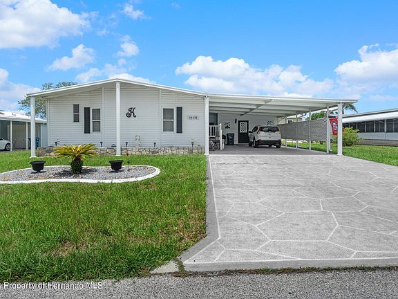 Active under contract accepting backups. GORGEOUS... MOVE-IN READY... FULLY FURNISHED 1,428 sqft 2BR/2BA ''PALM'' MANUFACTURED HOME with huge double driveway and 2-CAR CARPORT built in 1993 with spacious and convenient split floor plan, excellent for entertaining those friendly visitors in the Sunshine State. Lovely formal living and dining rooms with vaulted ceilings, plus a bright and spacious eat-in kitchen with lots of cabinets and counter space and large area for kitchen table with charming built-in desk area with even more additional cabinets. The master suite features extra-large master closet and roomy master bath with oversized shower and tons of vanity space and storage cabinets. The huge guest bedroom can almost seem like a second master bedroom. But, there's more!!! Spread out and relax in the tremendous 21x13 enclosed sunroom/family room with vinyl windows and entrance into the carport area with enclosed laundry room with even more closed space for even more storage!! Some Updates include: NEW Hot Water Heater; AC with UV Light System (keeping you safe from bacteria) and 2015 Reroof. So much to enjoy in this sought-after 55+ community where you OWN YOUR OWN LAND and enjoy amenities like heated pool, tennis, golf course, horseshoes, bocce, community center, pickle ball and a lots more! ...DON'T MISS IT YOUR CHANCE... CALL NOW TO SCHEDULE YOUR SHOWING... AND MAKE AN OFFER TODAY!!!
