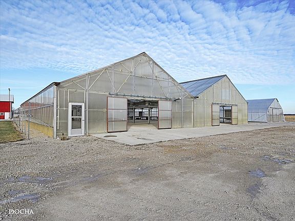 5 ACRES (more available), 4 GREENHOUSES, POLE BARN, DAIRY BARN and FARMHOUSE on NATURAL GAS! Previously operated as a Greenhouse, this property is well-suited for commercial greenhouse operations, agricultural use, horticulture, or a rural business allowing multiple income-producing structures. At the core of the operation are two modern gutter-connect greenhouses, each measuring 42x96, offering over 8,000 square feet of controlled growing space. These greenhouses feature heat, passive and mechanical ventilation, drip irrigation and in-floor radiant heat in propagation areas, allowing for year-round production. The layout supports commercial plant production, floriculture, specialty crops, hydroponics, propagation, retail or conversion to alternative covered uses such as an event venue or equipment storage. The third greenhouse is a modern, double poly freestanding greenhouse measuring approximately 30x96 with a concrete floor, roof peak vent and roll-up and overhead drip irrigation. A fourth greenhouse, measuring approximately 30x70, is a single poly structure with a gravel floor, offering additional flexibility for seasonal growing or storage needs. A 16x42 office / head-house connects the greenhouse complex directly to the pole building, creating an efficient workflow between production, administration and storage. The 43x62 pole building has been freshly painted and features a combination of concrete and gravel flooring. It is well-suited for machinery storage, fleet vehicles, contractor operations, warehousing, fabrication or general commercial use tied to an on-site business. The dairy barn has been freshly painted in classic red and white and has been exceptionally maintained, highlighted by a beautiful hay loft with full staircase access and the original milking room at the front of the building. Two grain bins on the property are equipped with dryers, stirators and aeration floors, making them functional for grain, seed, feed or bulk material storage. The updated farmhouse offers four bedrooms, two-and-a-half bathrooms and a full unfinished basement. The country kitchen includes oak cabinetry, stainless steel appliances and table space, while the oversized family room features a stone accent wall with a fireplace. The primary bedroom and bathroom are located on the first floor. Recent updates include a newer roof, kitchen improvements, carpet, interior paint, exterior paint and landscaping. The home can serve as an owner-occupied residence, employee housing or office headquarters. An additional 35 acres and an extra residential building permit are available for an additional cost, offering expansion potential for farming, business growth or future development. Ask your agent for details. The combination of expandable acreage, multiple outbuildings, greenhouse infrastructure and grain storage creates a flexible live-work environment that can continue in greenhouse production, support a new agricultural or rural commercial venture, or be repurposed into storage, workshop, processing, ag-retail or equipment-based operations as business needs evolve. Taxes are based on 40 acres. Desired acreage will be split from larger parcel and new PIN # created.