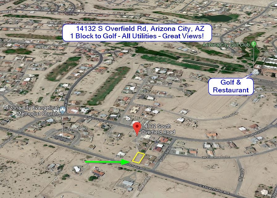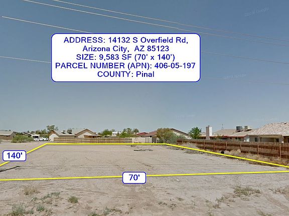Seller financing, refundable down payment with credit card, and video walk through can be found at the website link at the bottom of this page called: See listing website. Clean lot in neighborhood with beautiful homes, backing up to a cul-de-sac, just one block to the Arizona City golf course, one mile to market, restaurants, gas, city library, and mountain and farmland views in all directions! There are large estate lots across the street so this area will probably always stay peaceful and quiet. Comparables: There are 169 similar lots for sale on Zillow and the lowest price is $4,700 - see picture. Secure this property today with a 14-day refundable credit card down payment and get the best price out of 170 lots listed in Arizona City! Call Kevin Corcoran today and visit the listing link at the bottom of this page for complete order details.
