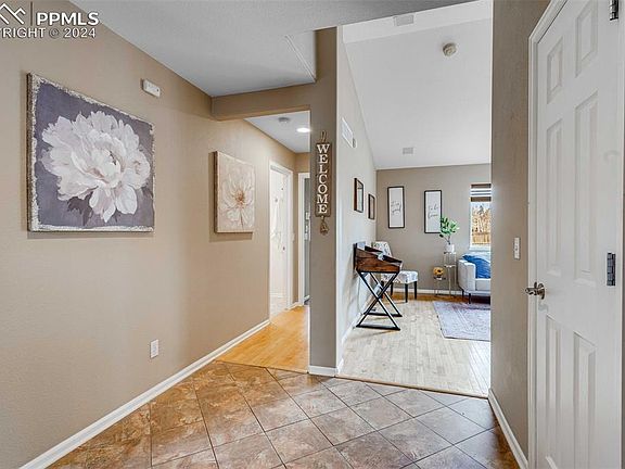 Remarkable Academy District-20 Rancher! Situated on a spacious lot in Falcon's Nest, this home is truly a gem. As you pull up the extended driveway, the well-manicured landscaping and clean stucco exterior immediately catch your eye, hinting at the care and attention upon this residence over the years. A charming stamped concrete walkway leads you to the backyard oasis, where breathtaking mountain views await. Picture yourself unwinding under the stars beside the crackling fire pit or enjoying the serenity of the oversized stamped concrete patio, surrounded by lush greenery and two thriving apple trees. Stepping inside, the tiled landing sets the stage for the comfort that awaits within. Heading into the family room, the real hardwood flooring and vaulted ceilings creates an ambiance that is both airy and inviting, amplified by the warmth of a gas fireplace and a designated dining space perfect for intimate gatherings or festive celebrations. Just off of the family room is your kitchen, featuring white countertops, light-accented backsplash, and ample storage space within its cabinets and pantry. There's also space to add your stools and enjoy meals at the countertop. Retreat to the tranquility of the three bedrooms, each offering its own unique sanctuary. The brand new carpet adds a touch of plush comfort underfoot, while the primary bedroom boasts a spacious walk-in closet with custom shelving and an ensuite bathroom adorned with an upgraded vanity and a convenient tub-shower combo. Do not miss out on the opportunity to own this amazing home!