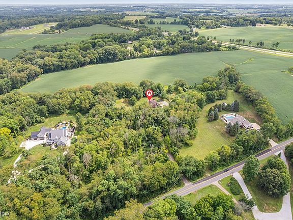 A private drive takes you back to this stately home nestled on 5 acres of nature. Just sit back and enjoy panoramic views of the grounds and wandering deer among the tree line. This custom-built home by KNL showcases a wonderful open floor plan. 2-story foyer with hardwood floor transitions to the formal dining room and dramatic great room with 20 ft. ceilings boasting a wall of windows. 9' ceilings and Cherry wood throughout the 1st-floor feature crown moldings, chair rails, and attention to detail. An impressive gourmet cherry kitchen with a built-in wine rack, a breakfast bar with Corian countertops adjoining the dinette area, and a hearth room with a see-through stone fireplace. Retreat to 1st-floor owner's suite with glamour bath highlighting above skylight, jetted tub, and separate water closet with tiled shower and walk-in closet. The sunroom/den leads to a stamped concrete patio. Laundry rm with built-in ironing board, cabinets, and laundry sink complete the main level of this home. The 2nd floor has an open loft, 2 spacious bedrooms, and a bath with granite countertop. 13 13-course walk-out lower level with french doors that lead to a stone patio, adding 1000 sq. ft of additional living space with a billiards area, exercise area, full bath, and family room. The three-car garage includes hot & cold water, a drain, a sink, attic access, a man door, a storage closet, and a shed. Other features include a security system and new geothermal heat.