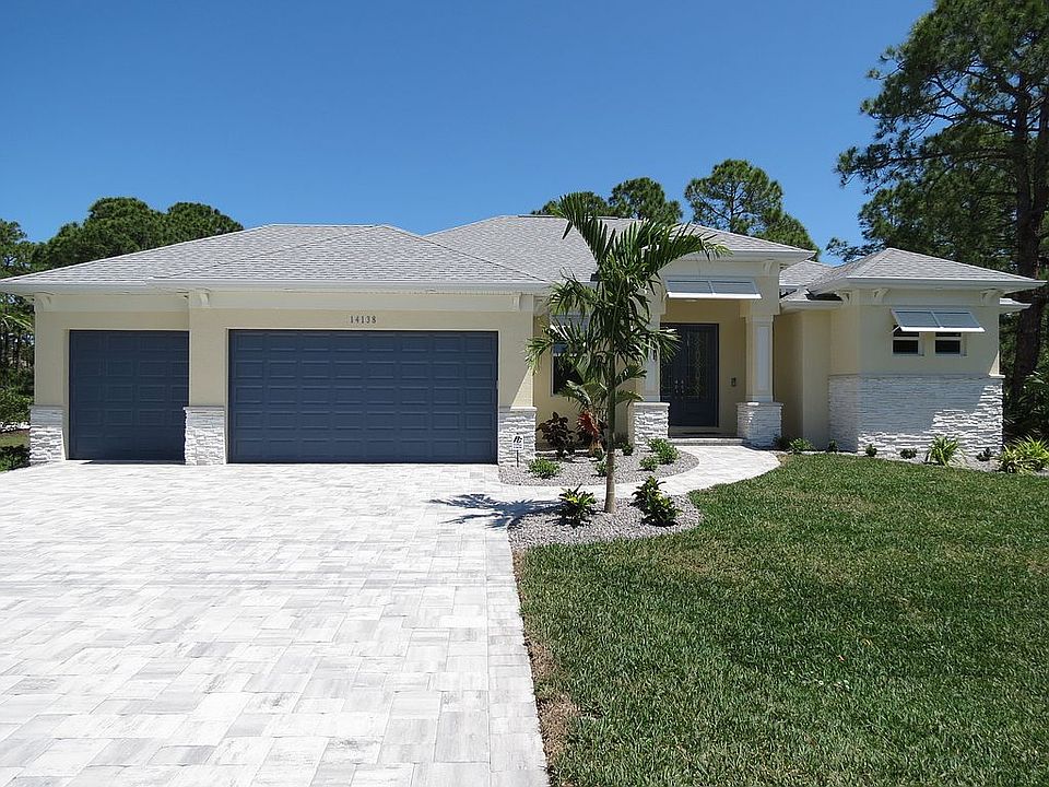 This spacious and elegant home will take your breath away, from the moment you step inside. This is a 3 bedroom, 2 bathroom, 3 car garage home, also with an office, swimming pool and numerous upgrades throughout. The home was utilized as a Model Home with a local building contractor, as this house has not been lived in, and is in pristine condition. Irrigation system, security system, full size laundry room, walk in master shower with etched glass enclosed with LED tape lighting, toe kick lighting at master bathroom vanities. The home also has all impact windows and sliders around entire perimeter of home. Porcelain plank tile throughout home. Walk in pantry. Kitchen island is 10' long, granite countertops throughout. Rope lighting in crown molding at Great Room ceiling. Coffered ceilings in office, great room, and master bedroom. Home is also plumbed and wired for a future outdoor kitchen. This elegant home is available for immediate occupancy. Only accepting serious inquiries from buyers. No commission paid for the sale of this model.