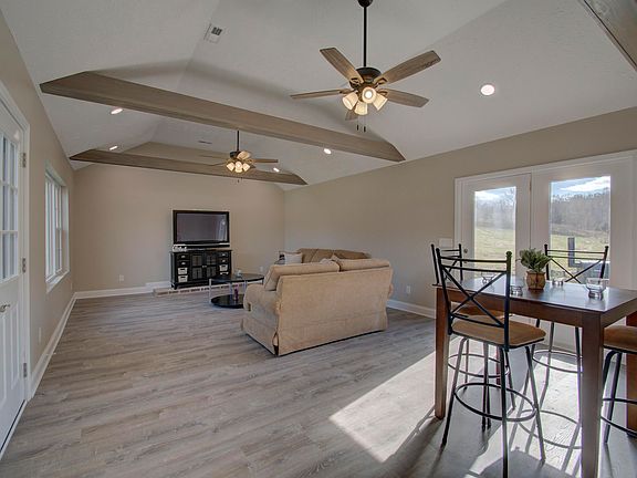 - Laminate Counters, Kitchen Island, Pantry, Open Floorplan, Eat-in Kitchen, Chandelier, Beamed Ceilings, Ceiling Fan(s), High Ceilings, Recessed Lighting, Vaulted Ceiling(s)