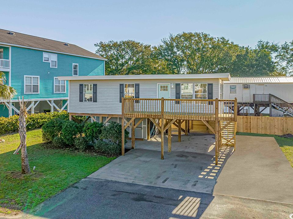 East of Business 17 in Garden City. Raised beach home with great updates and solid wood shiplap and nautical color theme. 3-bedroom and 1.5-bathrooms. Kitchen has been fully redone with brand new cabinets, granite countertops, stainless steel appliances and big island. New vinyl plank flooring in all rooms except tile in the bathroom. Bathroom includes custom bath hardware system in the tub-shower system. Brand new mini split HVAC unit with 4 heads with individual temperature control. Roof was replaced with EPDM rubber membrane system. House also features a half bath downstairs in the storage with an outdoor shower. Also has a great bar area setup under the house. Flood vents are in the finished space under the house. Both short and long term rentals allowed. No HOA. Seller is a licensed SC Real Estate Agent.