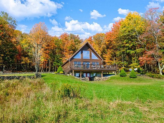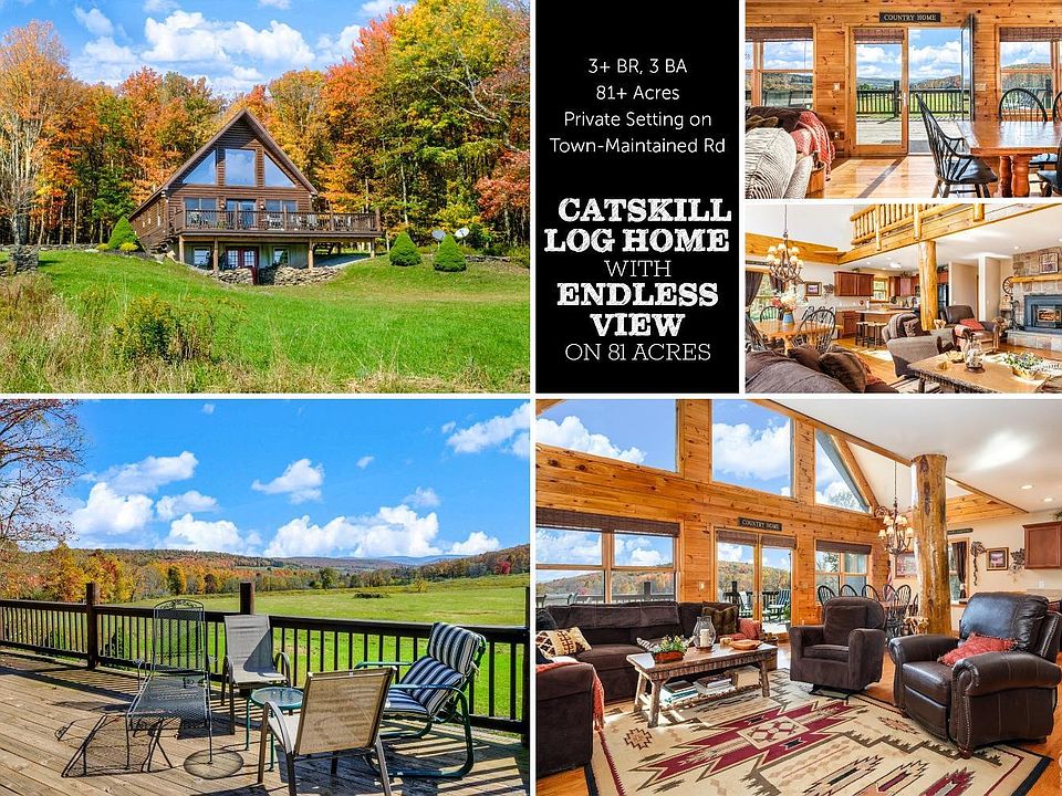 What's your favorite season? Winter, spring, summer or fall, this gorgeous Catskill Mountain setting will take your breath away. The view from the great room or the attached deck looks out over roughly 12 acres of hayed fields with the West Branch of the Delaware River Valley in the distance. That 10 mile view will never get old! In the fall it is a palette of perfection. The winter, a gleaming vista of vastness. In spring, fantastic freshness with growth all around you. This 1800+ square foot log-sided custom-built home on 81+ acres is truly a private retreat. 70+ acres of woodland behind the house offers hours of hiking, playing, and superior hunting. Built in 2013 and gently used, this well-cared-for home has everything you'll need: 3+ bedrooms, 3 full baths, stone-framed QuadraFire wood stove, 2-story great room with a huge wall of glass looking at an impressive Catskill Mountain View. Newly installed radiant heating and on-demand propane fired water heating systems make for superior comfort and efficiency. This stylish log home features a mix of crisp white walls and classic log accents and an unparalleled private setting outside that assures you will not be disturbed. Minutes from the Delaware county seat of Delhi NY, this property is an ideal get-away for an even better full-time home in the mountains.