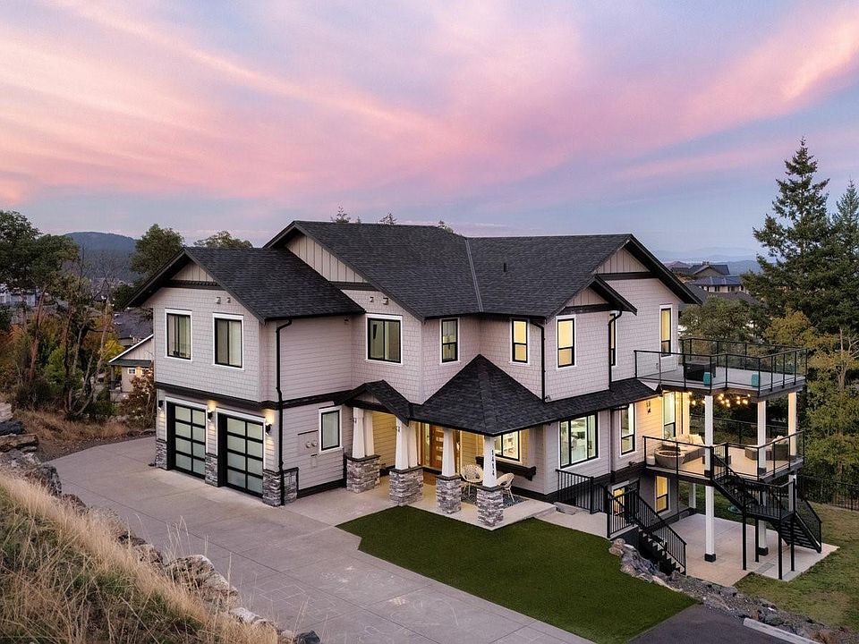 Welcome to 1414 Grand Forest Close, a custom-built family residence perched on Bear Mountain, showcasing sweeping ocean, city, and mountain vistas from every principal room. The entry level presents a chef’s kitchen with a quartz sit-up island, built-in coffee station, and a dedicated dining room highlighted by a bespoke wine wall. The living room opens seamlessly to a wraparound patio, perfect for entertaining or unwinding against the backdrop of stunning views. The primary suite features a lavish 5-piece ensuite, walk-in closet, cozy fireplace, and a private top-floor deck. Additional bedrooms include custom built-in closets and a shared 5-piece Jack-and-Jill bathroom. The lower level impresses with a spacious media room, stylish bar with beverage fridge, guest bedroom, and a versatile office. Walk out to a landscaped backyard from the covered patio. Topping it off is a private 2-BEDROOM SUITE above the garage with its own entry and extra parking.