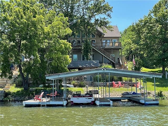 This home is being sold Turn Key! You will be able to move in and start enjoying the lake immediately! Fantastic Opportunity to own this 4,000 sq ft. waterfront home located on a great cove past Beach 2. Upon entering this spacious open floor plan lake home, you have the feeling of being in a lakeside retreat! The entry opens to a gorgeous living area with an entire wall of lake view windows, fireplace, open stairway to cozy loft bedroom, and open to large dining area w/ walkout to lakeside covered deck w/ ceiling fans, plenty of room for comfy seating and dining areas. The adjoining kitchen area is complete w/ appliances, walk in pantry and large entertaining island. Master suite is off the living area w/ walk out to deck, shares fireplace to living area, lg walk in closet and lg Master bath w/ jacuzzi tub and separate shower. The main level also has guest bedroom and separate guest bath, utility rm and oversized 2 car garage. The home has extra wide halls and stairway, attic fan, and 2 separate washer/dryer hook ups. Lower level is great for entertaining, bar area already in place, and walkouts to lower-level deck area. This level has 2 bdrm, guest bath, bonus rm (which owner uses one as overflow bedroom), storm shelter area and mechanical room. Outdoor area is amazing, stairs lead from upper and lower decks to a fun enclosed shelter w/ covered bonus area. The 2-bay covered boat dock has lift and swim deck. Outdoor shower on lower level. The water views from this home are simply stunning! Please do not miss the opportunity to own this one! Most furniture inside and outside, all appliances, beautiful decor, dishes, foosball table, and paddle boat will be included. Boat and a few personal items excluded.