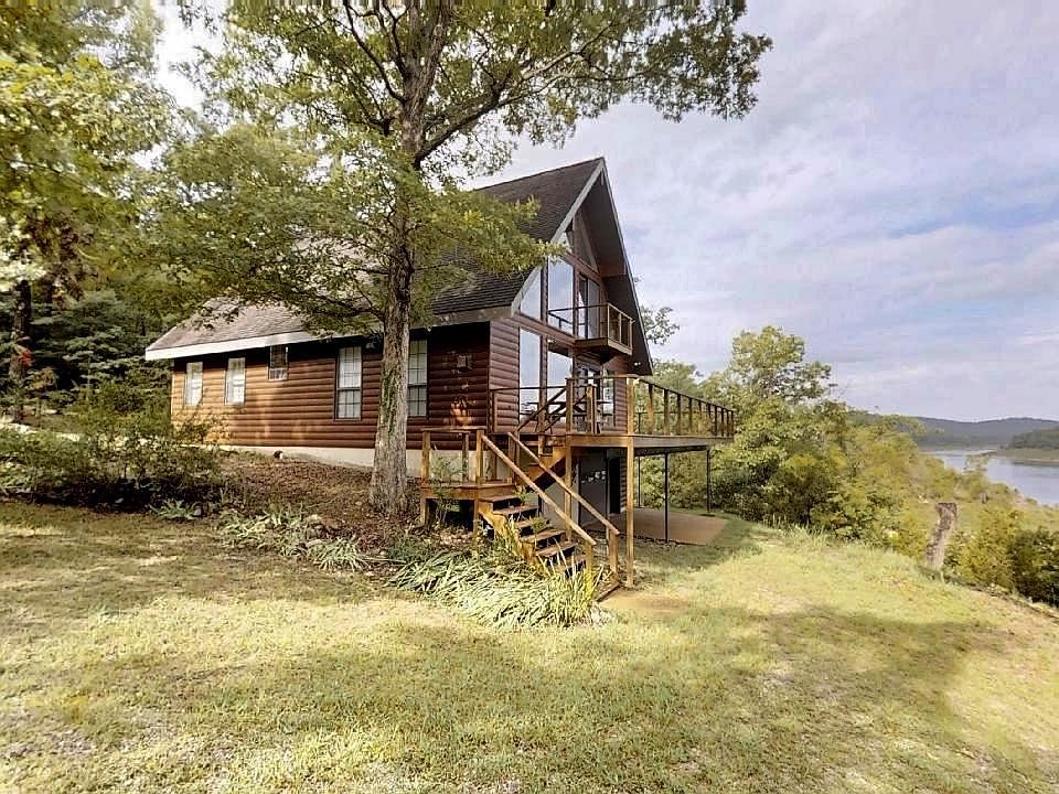 Great home overlooking Bull Shoals Lake. Terrific views from the living room, dining and study. This home has 60 wooded acres with over 3/4 mile Corp frontage. Rare opportunity. Buoy Permit.