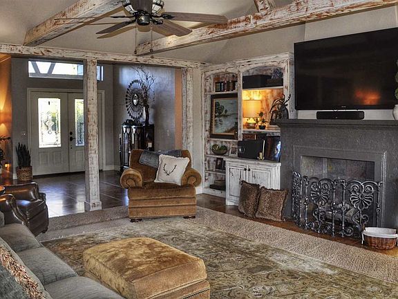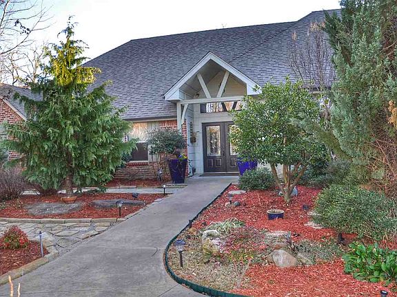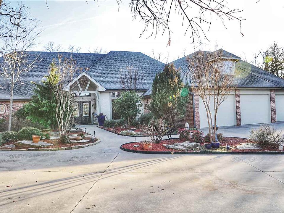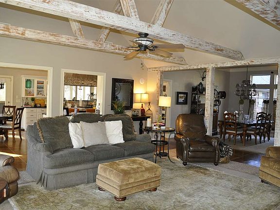 Just outside of town, situated in a peaceful country setting of 7.5 acres. The house features 4 bedrooms, 2.5 baths, large open living area with beamed ceilings & view of the outdoors, 2 dining areas & recently renovated kitchen. Natural light throughout, with detail in the molding, scored concrete flooring, & extras Recently built game room/living space above garage. Floor plan ideal for any entertainment style. patio, & deck overlooks the beautiful grounds & pond. Screened porch on west side allows you to enjoy the sunsets over the pond. Outdoors you have a stocked pond, decks overlooking pond, sprinkler system, above ground safe room & professionally installed outdoor lighting. Property has a 5-car detached garage with office & entertaining space. Listed by Teresa Young, Kay's RE. 580-467-7355. Call for appt. Sq footage does not include game room addition above garage.