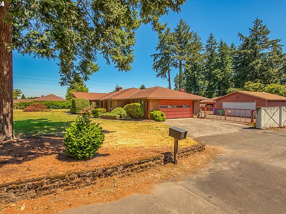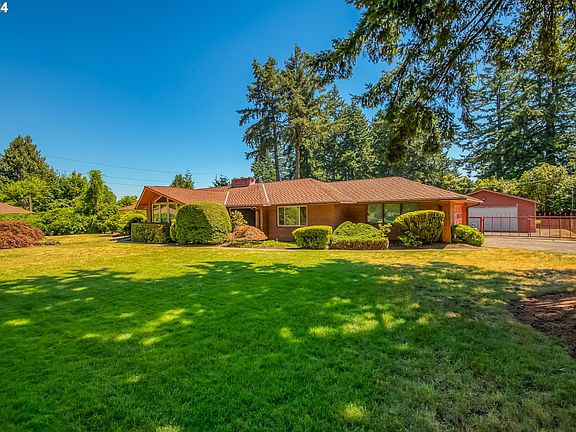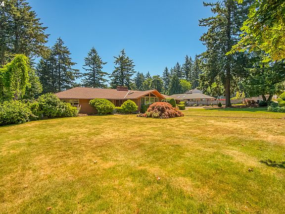 This mid-century modern home is located across the street from Glendoveer Golf Course. The home features four bedrooms and three bathrooms. Open beam vaulted ceilings in the living room with wood burning fireplace. Family room with fireplace and slider leading to sunroom and covered deck. Large dining room. Wood floors. Two car attached garage and a two car detached garage/shop. The home needs some cleaning and updating.