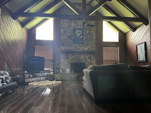 This is a beautiful updated modern cabin home with cathedral ceilings surrounding a stunning fireplace as the main focal point. The home sits on .93 acres and is surrounded by an additional 3.2 acres (sitting on just over 4 acres).