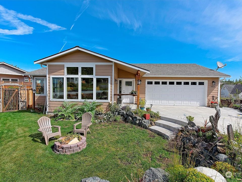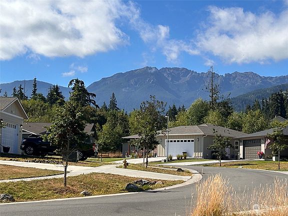 Discover this 2021 Move-in-ready home with its unobstructed south-facing Olympic Mountain views! This zero-entry property offers landscaped grounds separate fenced areas, serene backyard pond view. High-end finishes include quartz countertops, under-cabinet lighting & propane fireplace with a stone surround. Enjoy modern vinyl plank flooring, custom window treatments, and add two double-vanity bathrooms. Primary suite has a walk-in tiled shower with a bench & walk-in closet. Efficient ductless heat pump for heating/cooling. Outdoor living features permanent programable outdoor lighting in front, firepit, and a cozy landscaped & fenced side yard w/ covered deck & BBQ hookup. Large 2-car garage w/storage area, laundry sink & a Ring doorbell.