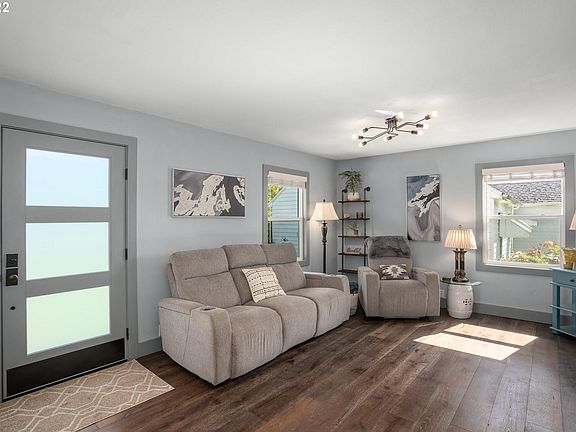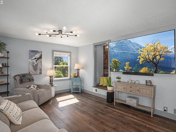 Beautifully remodeled and contemporary in style with views of Mt. Hood! 2nd story addition to include 2 Beds and 1 and half baths with sitting rm, bedroom on main, new vinyl windows, new siding, new metal roof with lifetime warranty, updated electrical panel, tankless water heater, Eng. hardwoods throughout, Open living area, newer int/ ext paint, new refrigerator/dishwasher, downstairs bath remdl 2021, new gas furnace and line added for gas stove, UV alkaline water filtration sys. Welcome Home! [Home Energy Score = 3. HES Report at https://rpt.greenbuildingregistry.com/hes/OR10202500]