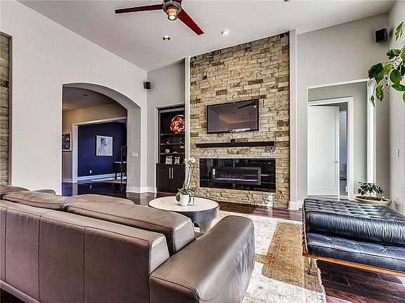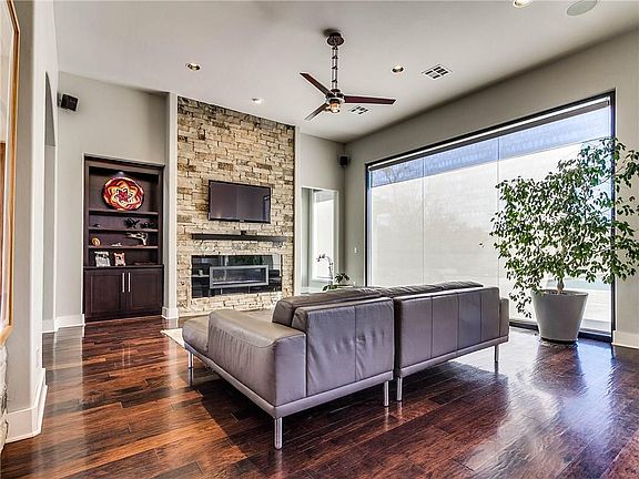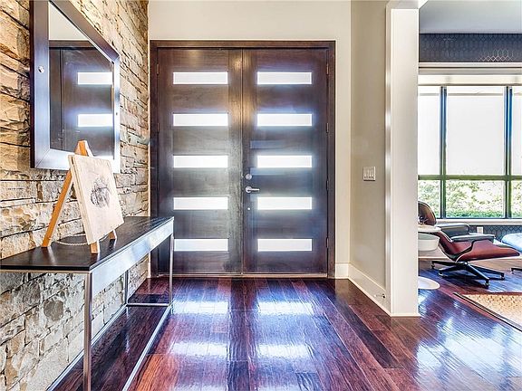 Step into this sleek modern home with huge wall window looking out onto a private yard with a pool. Large covered patio with outdoor kitchen area and fireplace. Inside you will find open concept living area, elegant study and formal dining area. Master bedroom suite downstairs with a true his and hers bathroom. There is also a butlers bar and wine room. Upstairs you will find another living area that could be an optional large bedroom, two more bedrooms and a theatre room. This home has a 3 car tandem garage. Surround sound system and security system. This home is move in ready! Home warranty included.
