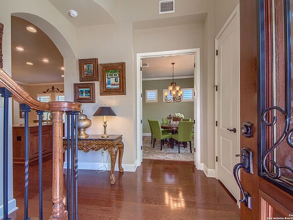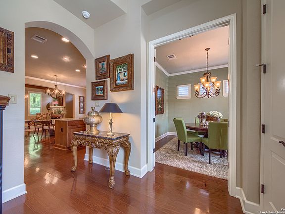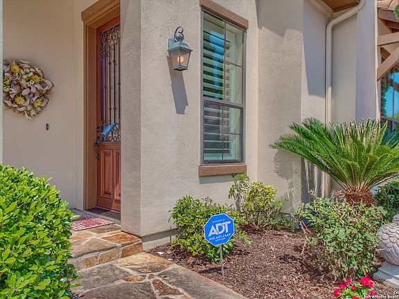 Immaculate and perfect down to every possible detail! Gently lived in, original owner home with incredibly low maintenance for a "lock and leave" lifestyle. Easy access to major employers, shopping, restaurants, entertainment and the San Antonio airport. Chef's appointed kitchen with gleaming granite, island kitchen, abundant counter and cabinet space, tile backsplash, stainless steel appliances, walk in pantry and showcase cabinets with glass fronts at the wine bar area. Separate formal dining room could very easily be a study at the entrance with french doors and tons of natural light. The family room is accented with architectural beams, wood floors and gas fireplace. Plantation shutters and crown molding throughout increase the elegance and enhance the aesthetics. Outdoor entertaining is a breeze with mounted TV, covered patio and plenty of deck space for BBQing on the weekends.